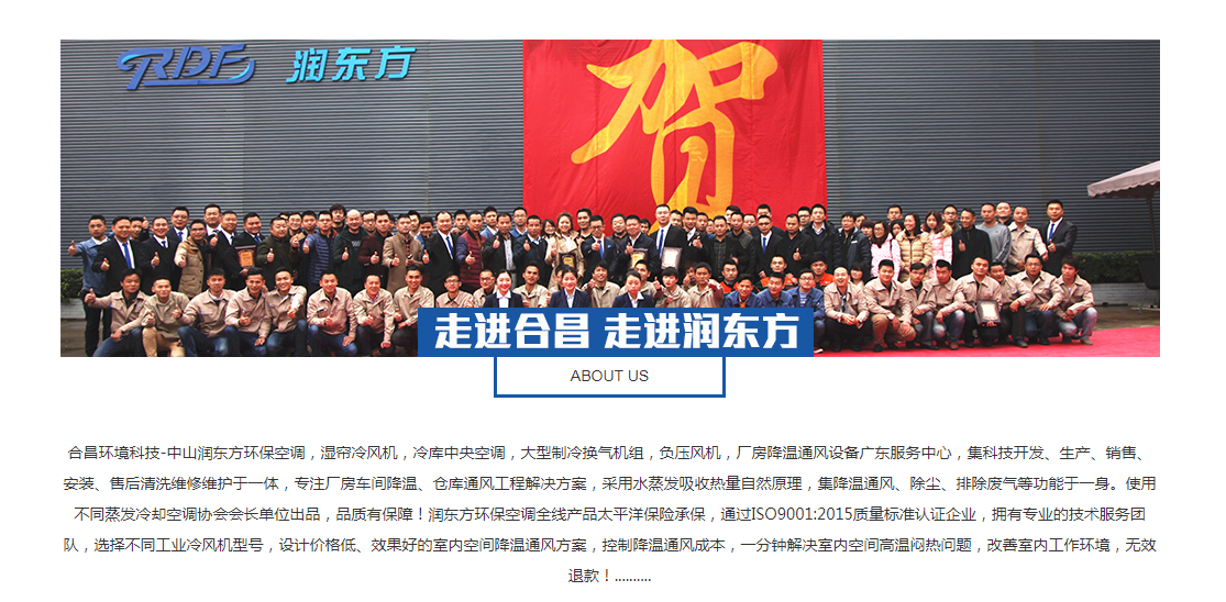 合昌環(huán)境科技-中山潤東方環(huán)保空調(diào),濕簾冷風(fēng)機(jī),冷庫中央空調(diào),大型制冷換氣機(jī)組,負(fù)壓風(fēng)機(jī),廠房降溫通風(fēng)設(shè)備廣東服務(wù)中心,集科技開發(fā)、生產(chǎn)、銷售、安裝、售后清洗維修維護(hù)于一體,專注廠房車間降溫、倉庫通風(fēng)工程解決方案,采用水蒸發(fā)吸收熱量自然原理,集降溫通風(fēng)、除塵、排除廢氣等功能于一身。使用不同蒸發(fā)冷卻空調(diào)協(xié)會會長單位出品,品質(zhì)有保障!潤東方環(huán)保空調(diào)全線產(chǎn)品太平洋保險承保,通過ISO9001:2015質(zhì)量標(biāo)準(zhǔn)認(rèn)證企業(yè),擁有專業(yè)的技術(shù)服務(wù)團(tuán)隊(duì),選擇不同工業(yè)冷風(fēng)機(jī)型號,設(shè)計(jì)價格低、效果好的室內(nèi)空間降溫通風(fēng)方案,控制降溫通風(fēng)成本,一分鐘解決室內(nèi)空間高溫悶熱問題,改善室內(nèi)工作環(huán)境,無效退款!..........