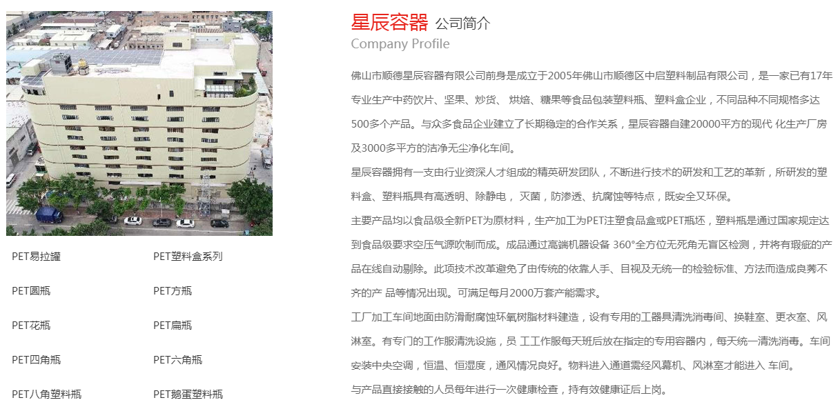 佛山市順德星辰容器有限公司前身是成立于2005年佛山市順德區中啟塑料制品有限公司,是一家已有16年專業生產飲片、堅果、炒貨、 烘焙、糖果等食品包裝塑料瓶、塑料盒企業,不同品種不同規格多達500多個產品。與眾多食品企業建立了長期穩定的合作關系,星辰容器自建20000平方的現代 化生產廠房及3000多平方的潔凈無塵凈化車間