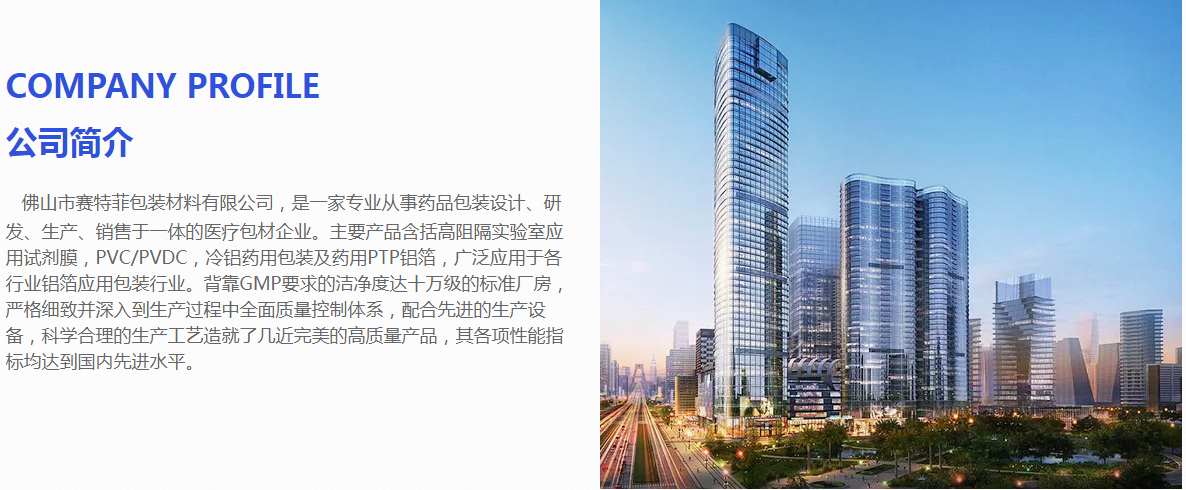 佛山市賽特菲包裝材料有限公司,是一家專業從事藥品包裝設計、研發、生產、銷售于一體的包材企業。主要產品含括高阻隔實驗室應用試劑膜,PVC/PVDC,冷鋁包裝及PTP鋁箔,廣泛應用于各行業鋁箔應用包裝行業。背靠GMP要求的潔凈度達十萬級的標準廠房,嚴格細致并深入到生產過程中全面質量控制體系,配合先進的生產設備,科學合理的生產工藝造就了的高質量產品,其各項性能指標均達到國內先進水平。
