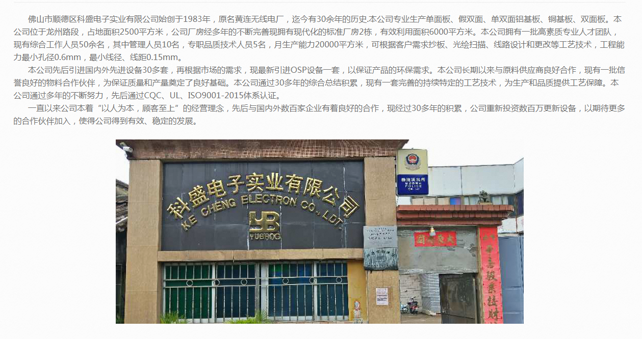 佛山市順德區科盛電子實業有限公司始創于1983年,原名黃連無線電廠,迄今有30余年的歷史.本公司專業生產單面板、假雙面、單雙面鋁基板、銅基板、雙面板。本公司位于龍州路段,占地面積2500平方米,公司廠房經多年的不斷完善現擁有現代化的標準廠房2棟,利用面積6000平方米。本公司擁有一批高素質專業人才團隊,現有綜合工作人員50余名,其中管理人員10名,專職品質技術人員5名,月生產能力20000平方米,可根據客戶需求抄板、光繪掃描、線路設計和更改等工藝技術,工程能力小孔徑0.6mm,小線徑、線距0.15mm。