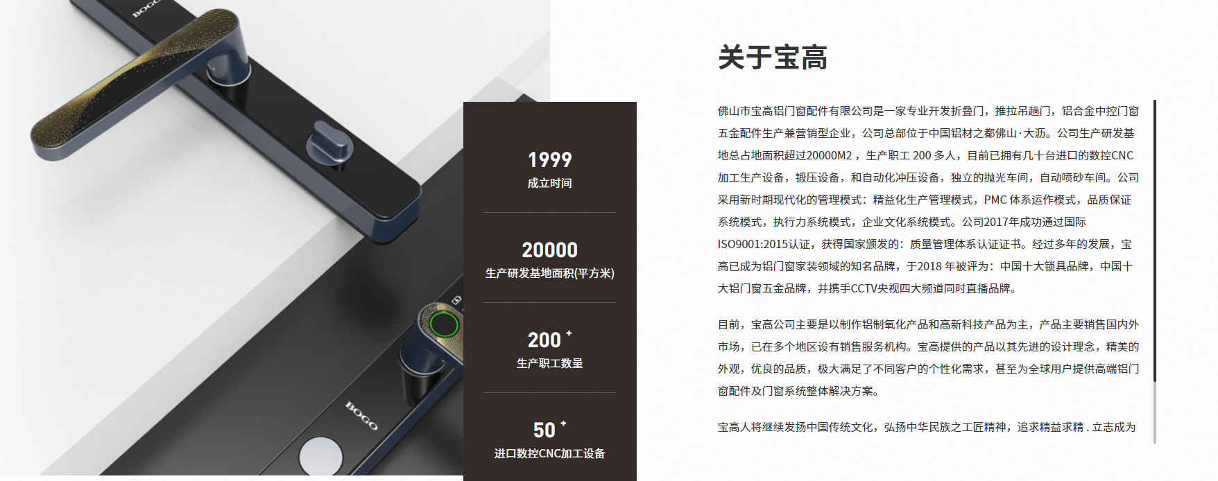 佛山市寶高鋁門窗配件有限公司是一家專業(yè)開發(fā)折疊門,推拉吊趟門,鋁合金中控門窗五金配件生產(chǎn)兼營銷型企業(yè),公司總部位于鋁材之都佛山·大瀝。公司生產(chǎn)研發(fā)基地總占地面積超過20000M2 ,生產(chǎn)職工 200 多人,目前已擁有幾十臺進(jìn)口的數(shù)控CNC加工生產(chǎn)設(shè)備,鍛壓設(shè)備,和自動(dòng)化沖壓設(shè)備,獨(dú)立的拋光車間,自動(dòng)噴砂車間。公司采用新時(shí)期現(xiàn)代化的管理模式:精益化生產(chǎn)管理模式,PMC 體系運(yùn)作模式,系統(tǒng)模式,執(zhí)行力系統(tǒng)模式,企業(yè)文化系統(tǒng)模式。公司2017年成功通過 ISO9001:2015認(rèn)證,獲得頒發(fā)的:質(zhì)量管理體系認(rèn)證證書。經(jīng)過多年的發(fā)展,寶高已成為鋁門窗家裝領(lǐng)域的品牌,于2018 年被評為:十大鎖具品牌,十大鋁門窗五金品牌,并攜手四大頻道同時(shí)直播品牌。