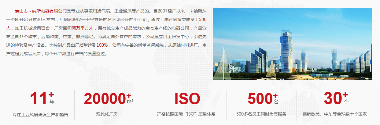 佛山市卡納斯電器有限公司是專業從事家用換氣扇、工業通風等產品的。自2007建廠以來,卡納斯從一個剛開始只有30人左右,廠房面積僅一千平方米的名不見經傳的小公司,通過十年時間演變成員工500人,加工機械近兩百臺,廠房面積兩萬平方米,擁有獨立生產成品能力的全套生產線的電器公司,產品分布各個城市,遠銷多地。為滿足國外客戶的需求,公司建立自主研發中心,引進先進的檢驗及生產設備。為控制產品出廠質量好,公司有完善的質量監督系統,從原輔材料進廠、生產過程到成品入庫,每個環節都進行嚴格的質量監控。