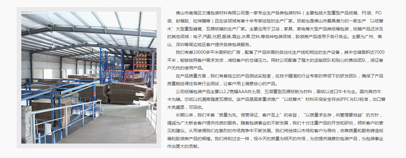 佛山市南海文博包裝材料有限公司(佛山文博紙箱廠)是一家專業生產大型重產品紙箱包裝的生產廠家。服務熱線:186-8880-6259。目前也是佛山市一家生產‘以紙替木’的大型重型紙箱生產廠家。主要涉及領域衛浴、家具等產品紙箱包裝。輻射到電子.汽配.化肥.服裝.酒業.水果.飲料.等各種包裝領域。主要為廣州、佛山、深圳等周邊地區客戶提供各類紙箱包裝產品生產設計服務。