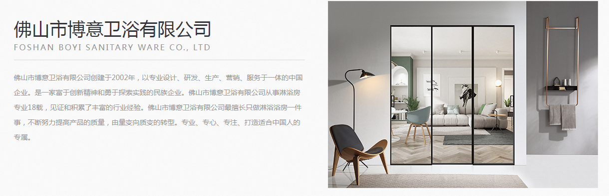 佛山市博意衛(wèi)浴有限公司創(chuàng)建于2002年,以專業(yè)設計、研發(fā)、生產(chǎn)、營銷、服務于一體的企業(yè)。是一家富于創(chuàng)新精神和勇于探索實踐的民族企業(yè)。佛山市博意衛(wèi)浴有限公司從事淋浴房專業(yè)18載,見證和積累了豐富的行業(yè)經(jīng)驗,公司主營淋浴房型材,不銹鋼淋浴房,淋浴房配件,淋浴房品牌,淋浴房廠家 ,整體淋浴房。佛山市博意衛(wèi)浴有限公司擅長只做淋浴浴房一件事,不斷努力提高產(chǎn)品的質(zhì)量,由量變向質(zhì)變的轉型。專業(yè)、專心、專 注、打造適合國人的專屬。