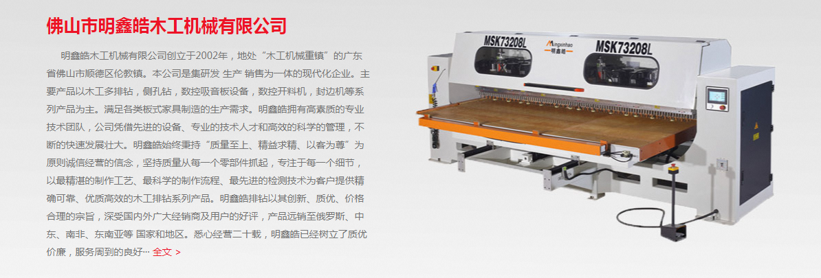 明鑫皓木工機械有限公司創立于2002年,地處“木工機械重鎮”的廣東省佛山市順德區倫教鎮。本公司是集研發 生產 銷售為一體的現代化企業。主要產品以木工多排鉆,側孔鉆,數控吸音板設備,數控開料機,封邊機等系列產品為主。滿足各類板式家具制造的生產需求。明鑫皓擁有高素質的專業技術團隊,公司憑借先進的設備、專業的技術人才科學的管理,不斷的快速發展壯大。