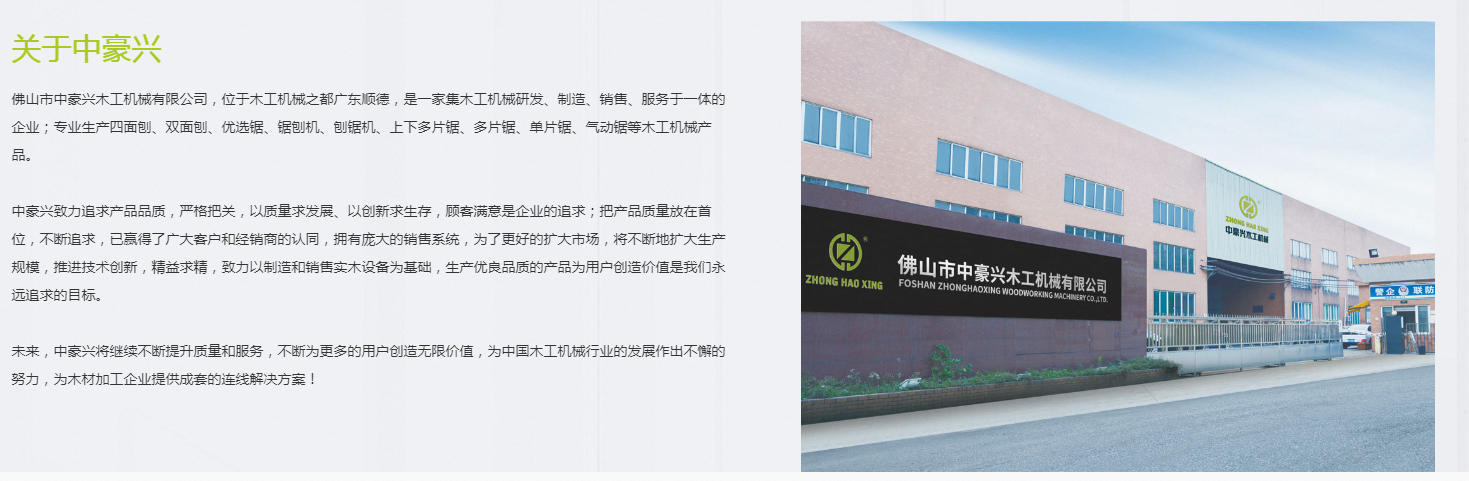 佛山市中豪興木工機(jī)械有限公司,位于木工機(jī)械之都廣東順德,是一家集木工機(jī)械研發(fā)、制造、銷(xiāo)售、服務(wù)于一體的企業(yè);專(zhuān)業(yè)生產(chǎn)四面刨、雙面刨、鋸刨機(jī)、刨鋸機(jī)、上下多片鋸、多片鋸、單片鋸、氣動(dòng)鋸等木工機(jī)械產(chǎn)品。