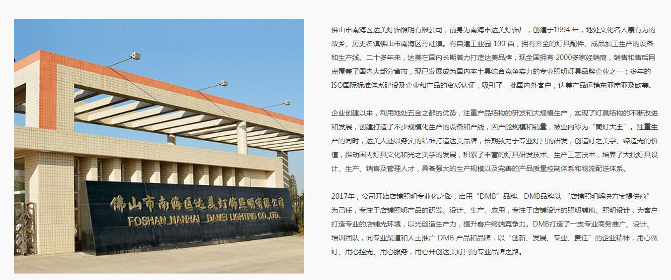 佛山市南海區達美燈飾照明有限公司,前身為南海市達美燈飾廠,創建于1994 年,地處文化名人康有為的故鄉、歷史名鎮佛山市南海區丹灶鎮。有自建工業園 100 畝,擁有齊全的燈具配件、成品加工生產的設備和生產線。二十多年來,達美在國內長期著力打造達美品牌,現擁有 2000多家經銷商,銷售和售后網點覆蓋了國內大部分省市,現已發展成為國內本土具綜合競爭實力的專業照明燈具品牌企業之一;多年的 ISO標準體系建設及企業和產品的資質認證,吸引了一批國內外客戶。