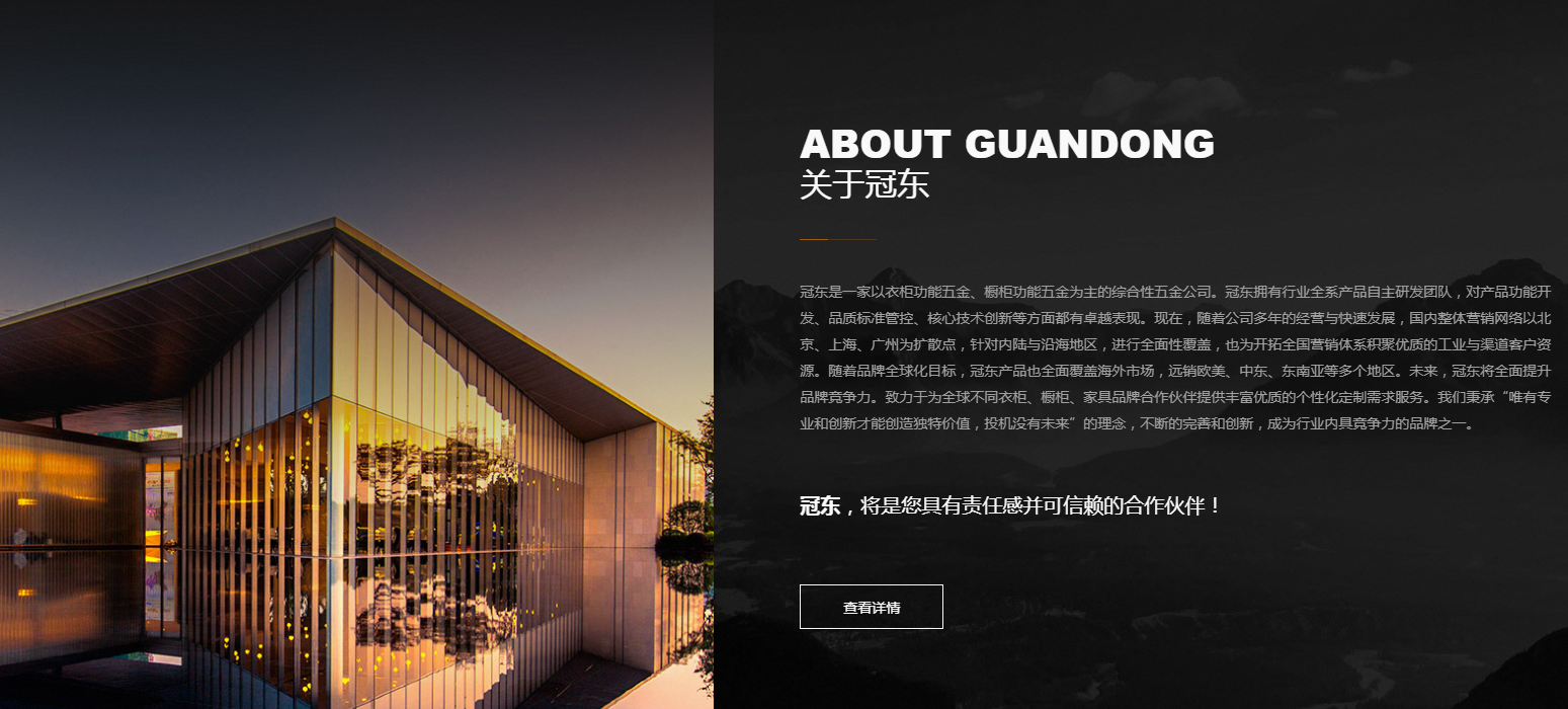 冠東是一家以衣柜功能五金、櫥柜功能五金為主的綜合性五金公司。冠東擁有行業(yè)全系產(chǎn)品自主研發(fā)團隊,對產(chǎn)品功能開發(fā)、品質(zhì)標(biāo)準(zhǔn)管控、核心技術(shù)創(chuàng)新等方面都有很好表現(xiàn)。現(xiàn)在,隨著公司多年的經(jīng)營與快速發(fā)展,國內(nèi)整體營銷網(wǎng)絡(luò)以北京、上海、廣州為擴散點,針對內(nèi)陸地區(qū),進行全面性覆蓋,也為開拓營銷體系積聚的工業(yè)與渠道客戶資源。隨著品牌目標(biāo),冠東產(chǎn)品也全面覆蓋海外市場,遠銷多個地區(qū)。未來,冠東將全面提升品牌競爭力。致力于為不同衣柜、櫥柜、家具品牌合作伙伴提供豐富的個性化定制需求服務(wù)。我們秉承“唯有專業(yè)和創(chuàng)新才能創(chuàng)造價值,投機沒有未來”的理念,不斷的完善和創(chuàng)新,成為行業(yè)內(nèi)具競爭力的品牌。