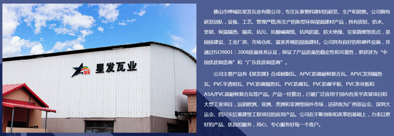 佛山市禪城區星發瓦業有限公司,專注從事塑料建材的研發、生產和銷售。公司擁有研發團隊,設備、工藝、管理嚴格;所生產的新型屋面建材產品,具有質輕、堅韌、保溫隔熱、隔音、抗污、抗酸堿腐蝕、抗風防震、防火絕緣、安裝簡便等優點,是園林建設、工業廠房、市場倉庫、溫室養殖的屋面建材。公司具有良好的軟硬件設施,并通過ISO9001:2008質量體系認證,保證了產品質量的穩定性和可靠性。