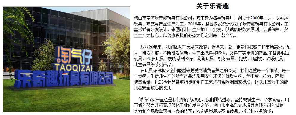 佛山市南海樂奇趣玩具有限公司,其前身為名嘉玩具廠,創(chuàng)立于2000年三月,以毛絨玩具、布藝等產(chǎn)品生產(chǎn)為主,2018年,整合多家資源成立了樂奇趣玩具有限公司,主營形式有研發(fā)設(shè)計、來圖訂制、生產(chǎn)加工、批發(fā),以誠信服務(wù)為原則,生產(chǎn)為核心,以健康積極的心態(tài)為您定制每一款產(chǎn)品。