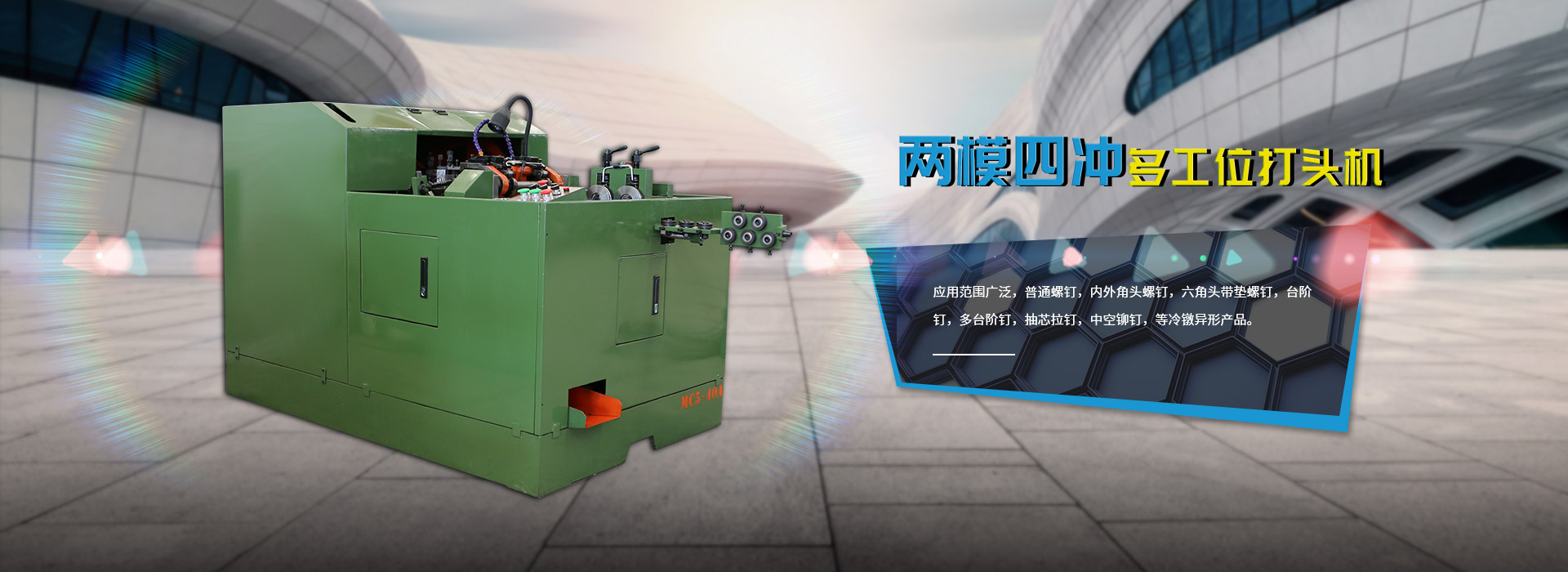 合興廠所生產的螺絲機均融合了多個地區的先進結構,加以精心改良。各系列產品的品種規格達180個,其中有特點的品種有:M10-360C整模雙導軌雙擊全自動冷鐓機、MR10-800分模雙擊“任意長”自動冷鐓機、M12-250C雙擊冷鐓機、M14-250C雙擊冷鐓機、X8-100B特大號銑尾機、M16-200四模四沖、三模三沖、三模五沖、二模四沖、二模二沖冷鐓機、制釘機、拉絲機、打勾機、界坑機、滾牙機等。